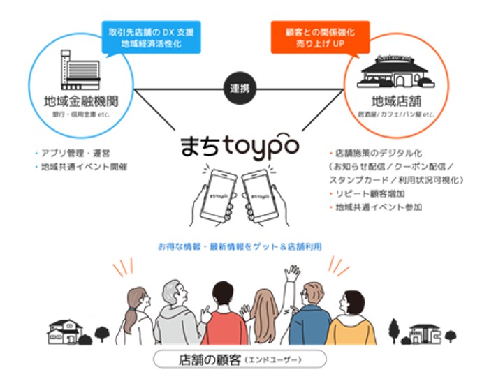 「まちtoypo®」は地域の中小・零細店舗向けにアプリを活用したリピーター集客サービスです。金融機関が店舗を取りまとめる座組にすることで単一店舗だけでなく、店舗間の相乗効果を生み出し、地域全体に向け利用促進や地域活性化を可能にしたサービスです。