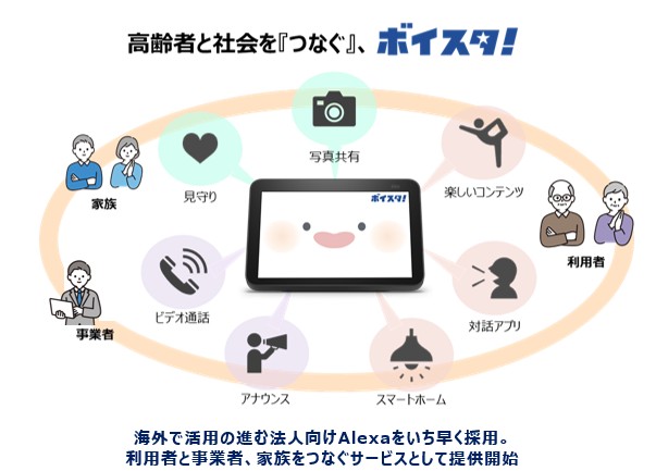 パーソナルAIアシスタント「Alexa」を活用した、シニア向けサービスです。「目で見て」「声で操作できる」をサービスコンセプトとして、利用者に健康でスマートな暮らしを提供し、ご家族には安心を提供します。