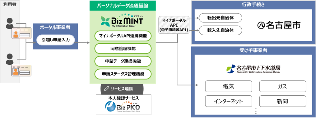 本サービスを介してマイナポータルと連携することで、利用者が引越しポータルサイト上で、自治体への申請(転出届/転入・転居予定の連絡)や、BizMINTと連携している受け手事業者に向けた申請を行うことが可能となります。